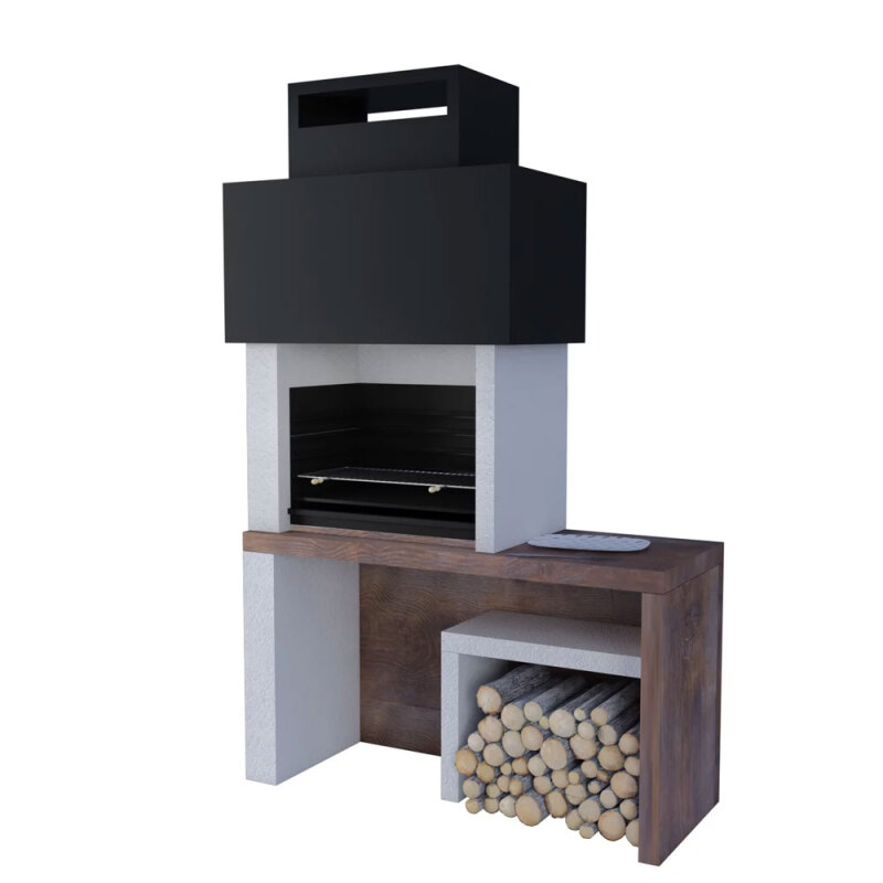 À côté du grill se trouve un bac à bois indépendant mesurant 33 cm de large x 45 cm de profondeur x 32 cm de haut, avec des briques réfractaires sur la base et sur les murs.