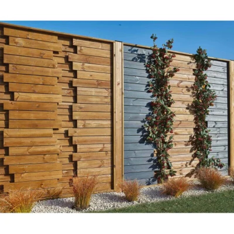 Ses lames de remplissage de 9 x 90 mm et de 10 x 36 mm positionnées en quinconce offrent aux particuliers un espace sans vis-à-vis à l’abris des regards. Un panneau brise vue robuste grâce à son cadre de 46 mm d’épaisseur et de 68 mm de largeur.